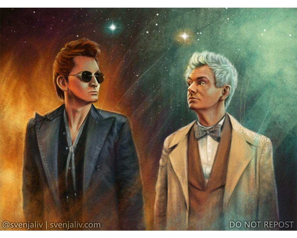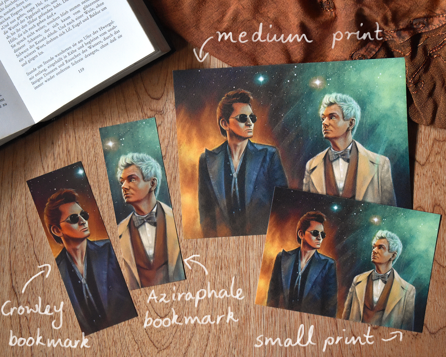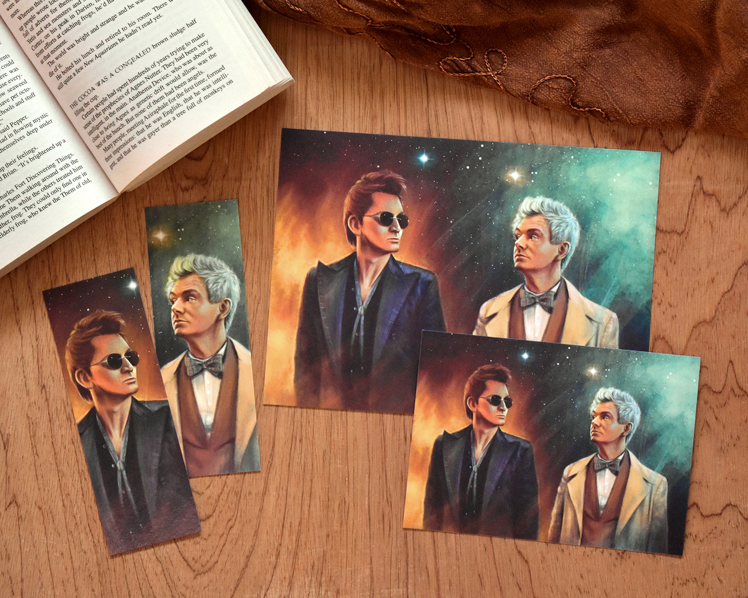 Art prints and bookmarks featuring art of Crowley and Aziraphale from Good Omens.
