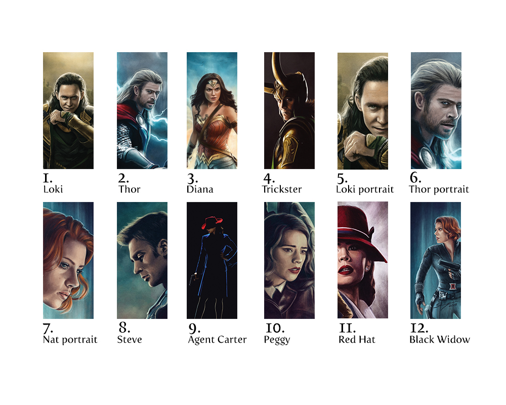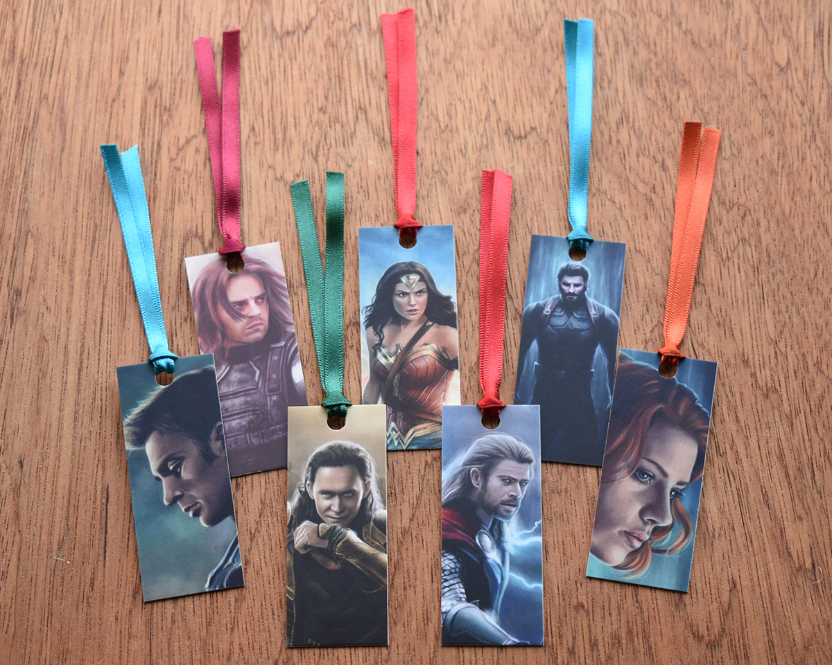 Bookmarks inspired by the Avengers, Wonder Woman, and other heroes! They’re printed on sturdy card stock with a matte finish (sourced from sustainable forests) and have a satin ribbon in a matching colour.